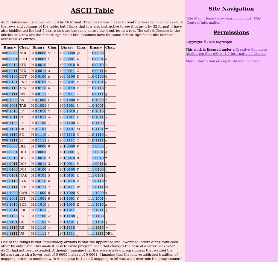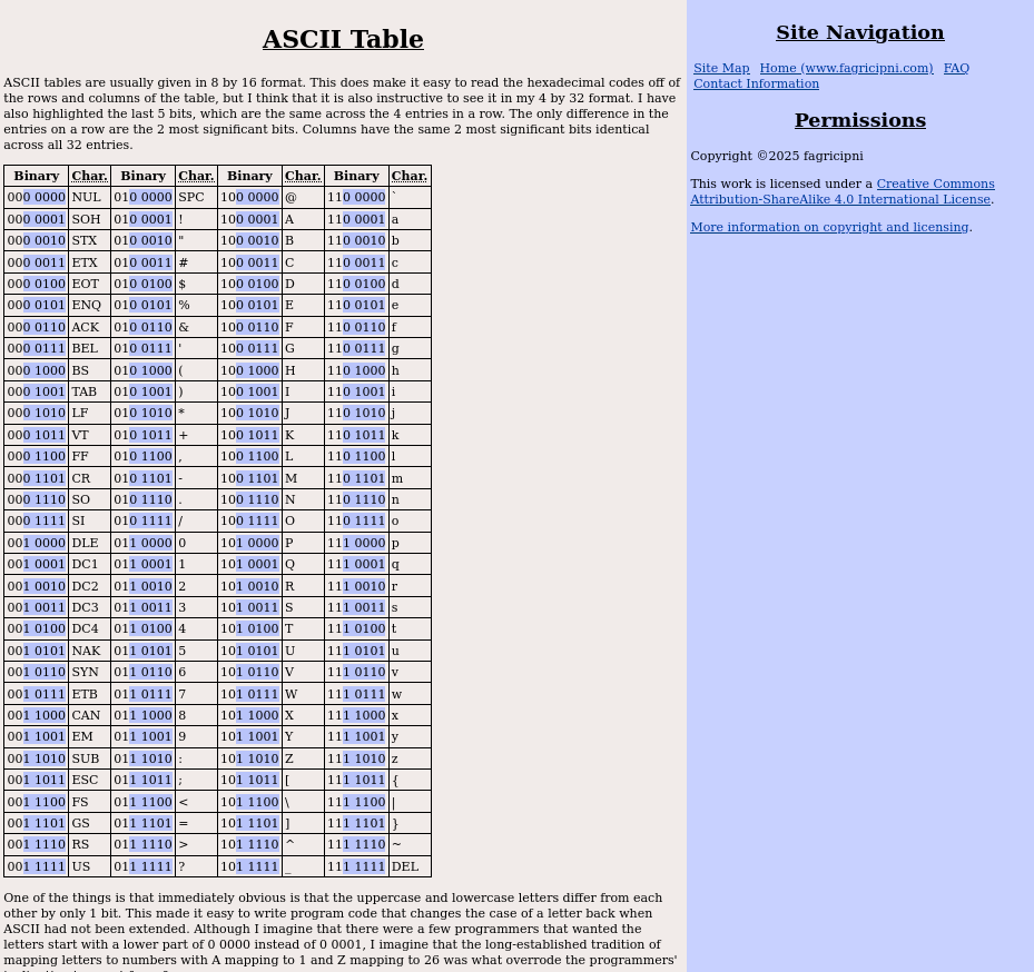 The other case I show images of here -- my ASCII table page -- causes me no concern, even though looking at the screenshot of ASCII Table through the protanopia filter as compared with the screenshot of ASCII Table without filtering shows even more similarity between the sidebar color and the highlight color in the table as viewed by a protanope than the Prefixes page. However, there is no need to distinguish between the sidebar color and the highlight color; the contrasts that matter are the distinction between the highlight color and main content background, and the distinction between the background colors of the main content and sidebar.